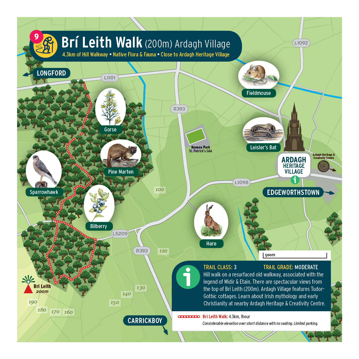 In the legend of Midir and Étáin, Brí Leith is where the Síd Mound of Midir is located, with the Corlea Trackway resulting from a forfeit he had to perform for the High King Eochaid after losing a game of Fidchell to him. Brí Leith was named by Midir in memory of his daughter Brí and her lover Leith. It is also called Sliabh Calraighe or Ardagh Mountain, which has sent many a person astray in the relatively flat lands of County Longford.