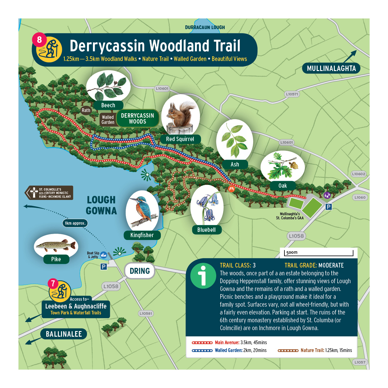 Derrycassin House was built in 1760 and at the time boasted beautiful walled gardens and an orchard that supplied the main house with fruit and vegetables. Unfortunately, the house no longer exists, but an afternoon spent walking the woods and taking in the splendid views of the lovely Lough Gowna transports the visitor back in time, as many of the tracks are broadly the same as those used by the original owners.